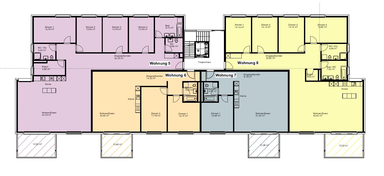 Die im Jahre 2007 fertiggestellten 2.5- bis 5.5-Zimmer-Wohnungen bestechen durch grosszügige Grundrisse, attraktive Aussenbereiche und einen zeitlosen Innenausbau. Hochwertige Parkett- und Plattenböden sowie ein Waschmaschinen-/Tumbler-Anschluss sind in jeder Wohnung vorhanden. Eine Tiefgarage mit Einstellplätzen, eigene Kellerabteile und Veloräume runden das Angebot ab.